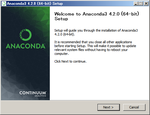 Python環境設定: インストールAnaconda 環境の使い方Anaconda 環境での Python のインストール/アンインストール方法を示します.また,ライブラリ (パッケージ) の追加/削除方法も示します. 目次ANACONDA を使う理由使いやすくて,初心者に優しいことです.私みたいにヘビーユーザーでない人には向いていると思います..実を言うと,私の周りに ANACONDA のユーザーが多いことも有ります. インストール (ANACONDA)Python は様々な方法でインストールすることができます.近頃は,Anaconda が評判が良さそうです.ここでは,Anaconda でのインストール方法を示します.以前の Python のバイナリーパッケージからのインストールについては,「Pythonインストール (古い情報) 」を参照ください. Windows 編インストールWindwos の場合,システム環境そのものが Python を使っていなので,何も気にしないでインストールすることができます.私は,次のようにしてインストールしました.