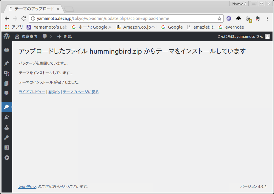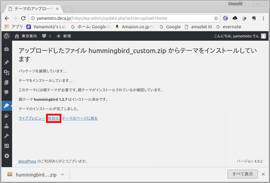 WordPress をインストールすると,いくつかのテーマも一緒にインストールされます.使いたいテーマを有効にすることができます.特に,hummgingbird を使う場合には「hummingbird_custom」を有効化しましょう.