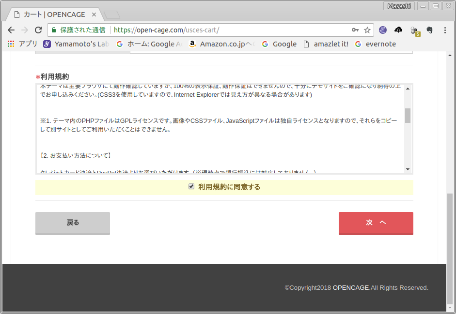 - 支払い方法のページが現れます.私は支払い方法に「クレジットカード」を選択しました.そして,「利用規約に同意する」をチェックし,次へ をクリックします(図5).