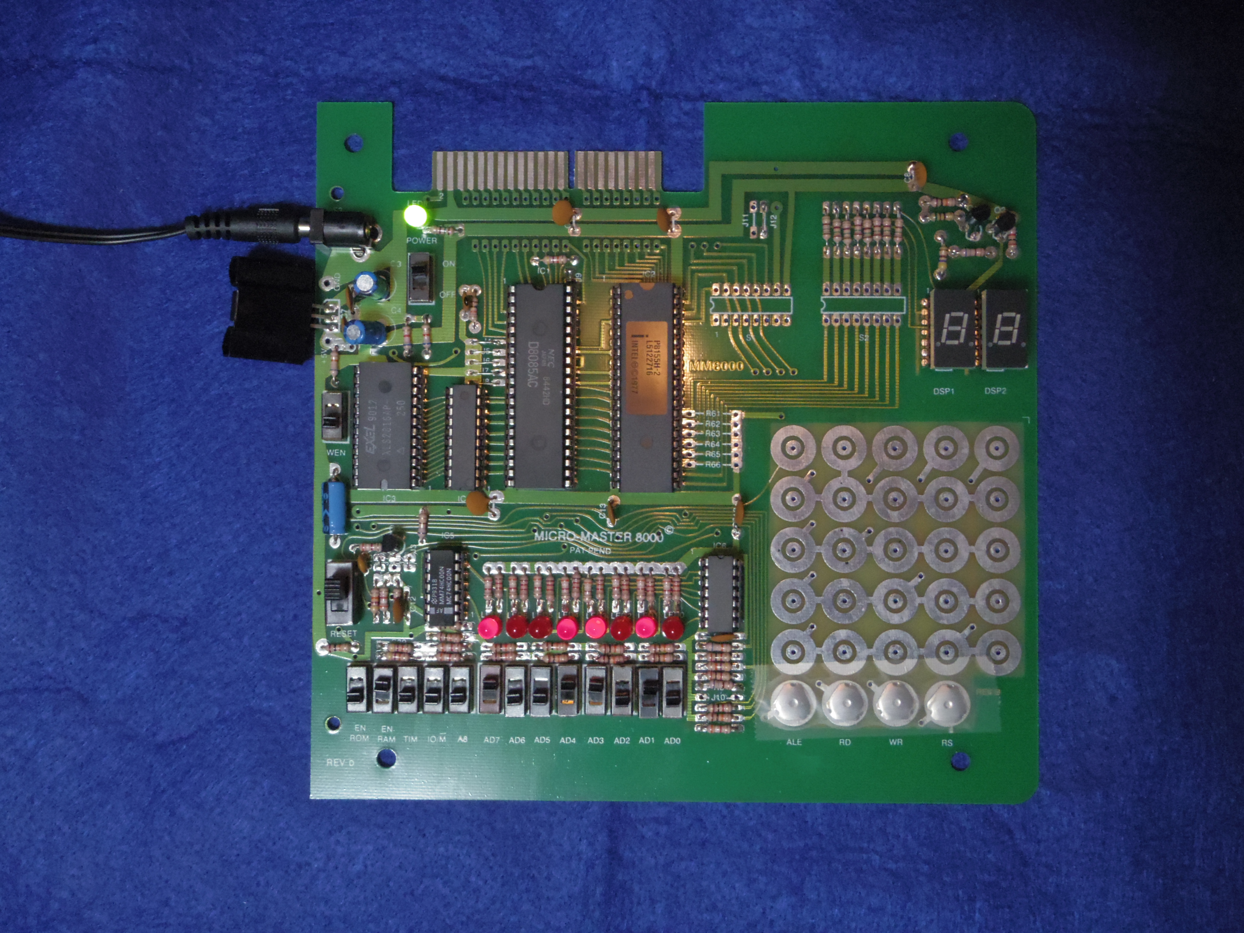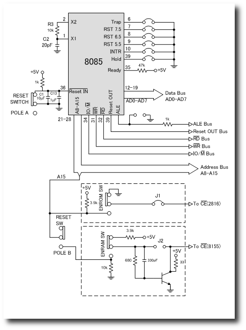 レッスン10で付け加えられた部品の回路を図2に示します.基板に8085プロセッサーを取り付けたことにより,(アドレス)データバスAD0からAD7とアドレスバスA8からA15,制御線のRESET,IO/M, RD, WR, ALEが使えるようになります.抵抗R7を通して8085のALEバスを使用可能にするために,ジャンパー線J10を取り除きました.8085がRESETのとき,前のレッスンのバスを制御するためのALEボタンを使用可能にするために,ALEの出力は0Vに維持される(?). いかなる想定外のインプットを避けるために,ジャンパーJ4からJ9を通して,TRAPとRST7.5,RST6.5,RST5.5,INTR,HOLD線はグランドレベル(0V)に,抵抗R60(47kΩ)を通してREADY線を+5Vにします.抵抗R3とキャパシターC2は8085のX1とX2に接続することにより,約1.5[MHz]のクロック周波数に設定されます. RESETスイッチがupの時,8085のRESET INは,RESET SWITCHを通してグランド(0:0V)に連結される.すると,8085はリセット状態になります.スイッチをdown側にすると,抵抗R1(47kΩ)を通してRESET INに高電圧(1:5V)が印加される.そして,アドレス0000から実行される.パワーONの時RESETスイッチをdown側にすると,8085のプログラムが実行される前に,システムを安定化させるために,キャパシターC1(10μF)とC13(1μF)により,RESET INにゆっくりと高電圧(5V)が印可されます(8085に電力が供給されて,しばらくしてRESET INに5Vを印可). RESETスイッチがup側で8085がリセット中のとき,A15を含むアドレス線はハイインピーダンス状態 —アドレスバスからそれら(メモリー)が切り離されている— になります.この状態でENRAMとENROMスイッチは,レッスン3とレッスン6で説明したとおり動作します.MM-8000の正しいオペレーションのために,RESETスイッチをdown側にする前に,ENRAMとENROMはdown側(off)にしなくてはならない.RESETスイッチがdown側にしたとき,アドレス線はローインピーダンス状態になります.アドレス線A15は,ENROMスイッチとJ1を通して2816(ROM)のCE入力を駆動します.アドレス線A15は,RESETスイッチのB側とENRAMスイッチ,J2を通して8156(RAM)のCEにも接続されている.As on the Data Bus lines the 3.9K pull up resistor R44 and the 10K pull down resistor R45 are overridden by low impedance A15 drive circuit in the 8085(本文はこうなっている.意味不明です.). PROCEDURE以下を実行して,初期化の動作を確認します.