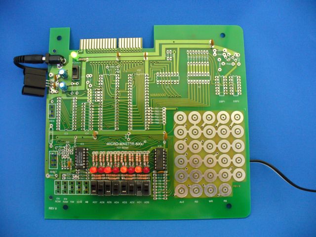 この後,マニュアルではアドレスバスとデータバスについて述べている.すこし,説明が必要であろう.このキットのMPU 8085はアドレスバスが16本,データバスが8本ある.8085は特殊で,アドレスバスの下位8本とデータバスの8本は同じピン(ICの電極)を使っている.そのため,ピンには AD0〜AD7 と名称が割り当てられている.アドレスなのかデータなのかは,8085の30番ピン(Address Latch Enable:ALE)の状態でわかる.アドレス信号出力になっているときには,ALEがHigh(5[V])になる. ASSENBLY INSTRUCTIONSLessonのタイトルと異なり,ここで製作するハードウェアーにはメモリーはまだ装着しない.丁寧な図があるのでその通りに部品を半田付けする. CIRCUIT DESCRIPTION電源とLED点灯回路の説明がある. 電源は付属の DC 9[V] のACアダプターから,3端子レギュレーター(L7805)で 5[V]をつくり,コンデンサーで平滑している. LEDの点灯回路は,74HC04や74HC00の出力回路に電流が流れこむ設計となっている.シンク(sink)で使ってる.ネットで調べると,74HC04のシンク電流は4[mA],74HC00は不明.ちゃんと動作しているのだから,いいのだろう. FUNCTINAL TESTスイッチと論理回路(74HC04:NOT, 74HC00:NAND)だけなので,問題なく動作した.