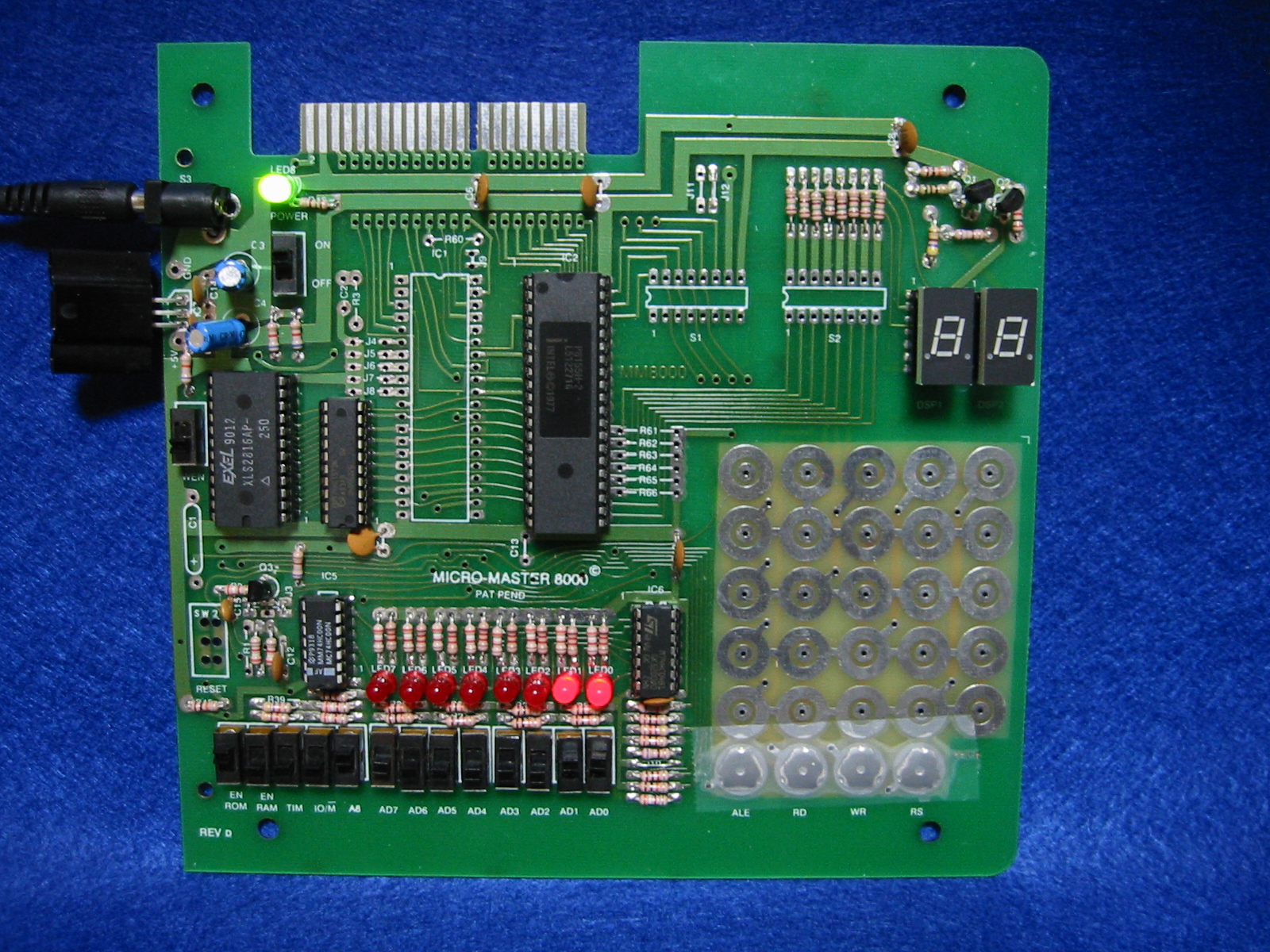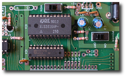 手動でのデータの書き込み/読み込みは,次のようにします.EN ROMスイッチをup側にすることにより,2816のCEピンがLになり,ROMは動作状態となります.次に,WENスイッチをupにして,キーボードのWRボタンとWEを接続します.AD0〜AD7のスライドスイッチで,書き込みアドレスを決めます.そして,ALEボタンを押します.次に,AD0〜AD7のスライドスイッチで,書き込むデータを指定します.WRボタンを押すことで,データの書き込みが完了します.データの読み込みの場合,はじめに,AD0〜AD7のスライドスイッチでアドレスを指定し,ALEボタンを押します.その後,RDボタンを押すことで,データを読み込むことができます.LEDでの表示が読み込んだデータです.