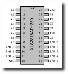 Lesson 3では,RAMについて説明しました.RAMに記憶されたデータは,電源をOFFにすると消えてしまいます.もし,全てのコンピュータープログラムがRAMに格納され,電源をONする度に,ユーザー自身が(手で)入力する必要があるならば,多くの時間が浪費されるでしょう.それゆえ,少なくとも一つのプログラム(モニターと呼ばれる)を不揮発性のROMに常駐させます.ROMのデータは,電源をOFFにしても消えまえん.ROMは, 消去可能なものと,消去不可能なものに大別できます.消去可能なROMは,紫外線を用いるなどいろいろな方法でプログラムを消します.消去不可能なROMはプログラムの書き込みは,一度限りです.MM-8000では,電気的に消去可能なROM(E2PROM:ElectricallyErasable Programmable Read Only Memory)である2816を使っています.その名(Electrically Erasable)の通り,2816と同様にプログラムの消去と書き込みができます.書き込み処理のためには,10[msec]の時間がかかります. 2816は,2000以上の1バイト(8ビット)の記憶領域があります.トータル 16[K bits]になります.これが名前の由来となっています.2816のピン番号は, 左の図のようになります. このROMのデータシートは,ここにあります. 2816のピンの役割簡単に2816のピンの役割を示します.このピンの使い方は,次の「2816の動作モード」でもう少し詳しく説明します.あるいは,データシートを読んでください. ADDRESS LINES (A0 〜 A10)2000のアドレスを指定するために,アドレス線は11本あります.210 2000 211ですから. INPUT/OUTPUT LINES (I/O 0 〜 I/O 7)アドレス線で指定されたアドレスのデータを読み書きするときに,データの入出力に使われます.一つのアドレスのデータは,1バイト(8 bits)なので,I/Oの線は,8本です. CHIP ENABLE (CE)表記の上線は,NOTを表します.いわゆる負論理と呼ばれるもの,LOW(論理:0,0V)の時にチップ(Chip)が動作状態(Enable)になります. OUTPUT ENABLE (OE)この線とCEがLOW(論理:0,0V)かつWEがHIGH(論理:1,5V)のとき,2816からデータを読み込むことができます. WRITE ENABLE (WE)この線とCEがLOW(論理:0,0V)かつOEがHIGH(論理:1,5V)のとき,2816にデータを書き込むことができます. 2816の動作モード2816のピンの役割を理解するために,その動作を説明します.ここでは, データシートにしたがい動作モードの説明を行います.ただ,データシー トを見ても「???」と思うようなところがありますので,自分で2816を動かして, その内容を理解することを勧めます. 以下に示すように,3つのピン(CEとOE,WE) の状態で,2816の動作モードが決まります.