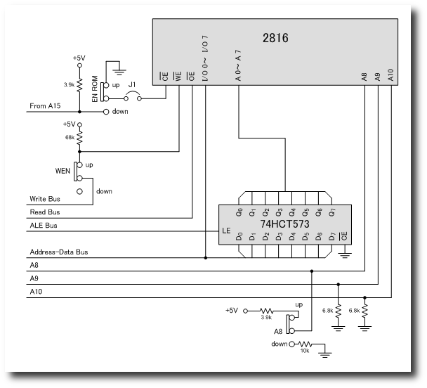 ASSEMBLY INSTRUCTIONSとくに難しい半田付けはなく,マニュアル(p.6-2)の通りにすれば,この Lesson の回路は完成します. CIRCUIT DESCRIPTIONLesson 6のROMの学習に使う回路は,下の図(ROM(2816)のテスト回路)の通りです.一部,MM-8000のマニュアル(Figure 6-3)とピンの名前が異なる部分がありますが,回路は同じです. また,この回路図には示されていないですが,「TEST PROCEDURE」での動作を理解する上で重要な接続もあります.