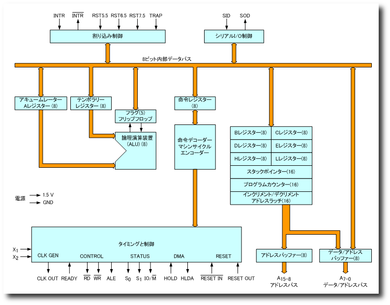 桁上げフラグCY(carry flag)は,算術演算命令や論理演算命令の結果によって,セットやリセットされます.たとえば,次のような1バイト同士の足し算で桁上げが生じた場合に,桁上げフラグCYがセット(1)されます.このフラグを使うことで,演算結果が8ビットに収まらない加算でも正しい結果を得ることができます. 10101110+ 01110100 100100010 加算演算の計算結果が8ビットでオーバーフローした場合,キャリーフラグがセット(CY=1)されます.オーバーフローが起きない場合には,リセット(CY=0)されます.減算演算の場合には,キャリーフラグは「上位の桁からの借り(ボロー)」になります.下の左側の例は,減算される数(10101110)よりも減算数(01110100)の方が大きいので,「上位の桁からの借り」は生じませんので,CY=0となります.一方,右側の例では借り(赤字)が生じますので,CY=1となります. 10101110 101110100- 01110100 - 10101110 00111010 11000110 ACフラグは,ビット3が桁上げや上位桁からの借りが生じた場合に,セット(AC=1)されます.キャリーフラグ(CY)がビット7で動作したのと同じことが,ビット3で起きます.このACフラグは,10進数演算の時に使います. 演算結果の正負を表すサインフラグ (S) は,算術演算命令や論理演算命令の実行結果が格納されるアキュームレーター (Aレジスター) の最上位ビットがセットされます.整数を 2 の補数で表すシステムでは,最上位ビットが 1 になると,その整数は負として取り扱われます.したがって,アキュームレーターの最上位ビットを調べることで演算結果の正負が分かります.コンピューター内部での負の整数の表現については,私の講義ノート「負の整数の表現」を参照ください. ゼロフラグ (Z) は,アキュームレーター (Aレジスター) の全てのビットがゼロの時,セット (Z=1) されます.反対にどれかのビットが 1 の時,クリアー (Z=0) されます.+1 加算命令 (INR) や -1 減算命令 (DCR) の結果にも,ゼロフラグは反映されます. アキュームレーター (Aレジスター) のビットの1の数が偶数の場合,パリティフラグ (P) がセット (P=1) されます.偶数の場合,クリアー (P=0) されます. スタックポインタースタックポインターは,スタックの最上位のアドレスが格納されます.スタックは,メモリー(RAM)の一部を使い,データの格納(PUSH)とデータを取り出し(POP)を行います.初期化時には,使用可能なメモリー最大の番地(最下位番地)をスタックポインターの値とします.スタックにデータがプッシュ(PUSH)されるとスタックポインターの値は減らされ,ポップ(POP)されると増やされます(スタックは,メモリーの下位から上位に向かって伸びます).スタックには,常に2バイトずつデータが格納されるので,スタックポインターは2ずつ増減します. 演算論理装置(ALU)ALUには,アキュームレーターやフラグレジスター,プログラマーがアクセスできないいくつかのテンポラリーなレジスターが含まれます.算術演算や論理演算,ローテート演算は,ALUによって実行されます.それらの演算結果は,アキュームレーターに格納されるか,他の場所で使うために内部のデータバスに送られます. 命令レジスターとデコーダーフェッチサイクルの間,命令の最初のバイト(オペコードを含んでいる)は,内部バスを通して8ビットの命令レジスターに送られます.つぎに,命令レジスターの内容は命令デコーダーが使います.タイミング信号によって発生させられるデコーダーの出力は,レジスターとALUとデータとアドレスバッファーを制御します.命令レコーダーと内部クロック発生器は,ステートとステートとマシンサイクルのタイミング信号を発生します. ピンアサイン