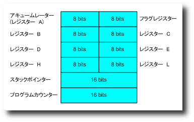 レジスターレジスターは,MPU の中にある記憶場所みたいなものです.8085 には,8 ビットと 16 ビットのレジスターがあります (図3).8 ビットのレジスターは 8 個(A, B, C, D, E, H, L, フラグ)あり,そのうち 6 個はレジスターペアとして使うことができます.レジスターペア (BC, DE, HL) は,16 ビットのレジスターとして使うことができます.これらのレジスターペアに加えて,8085A は 2 個の 16 ビットレジスター (スタックポインター, プログラムカウンター) があります.
