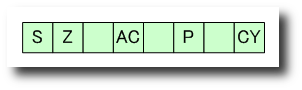 アキュムレーター (ACC あるいはAレジスター) は,算術演算や論理演算,データの転送,I/O の命令で使われます.汎用レジスターと呼ばれることもあります. プログラムカウンター (PC) は,次に実行する命令が格納されているメモリーのアドレスを保持します.8085A のメモリーアドレスしては16ビットなので,プログラムカウンターも 16 ビットです. BC と DE,HL は汎用レジスターで,命令により 8 ビットレジスターあるいは 16 ビットのレジスターになります.HL レジスターは,命令の操作対象のソース(元)やデスティネーション(目的)のメモリのアドレスを表すデータポインターとして使われます(具体的には,Lesson 8 の HL レジスターを使っている命令を参照してください).少ないですが,BC あるいは DE レジスターを間接アドレッシングに使う命令もあります. スタックポインター (SP) は,スタックのトップ (次に利用可能なスタックのアドレス) を示す特別なデータポインターです.16 ビットのレジスターで8ビットに分割することはできません.アドレスを表すため,必ず 16 ビット必要だからです. 8 ビットのフラグレジスターには,5 つの 1 ビットのフラグが含まれています.これらのフラグは,MPU の状態を表し,MPU の動作を制御します. フラグレジスター図4に,8085のフラグレジスターの構成を示します.