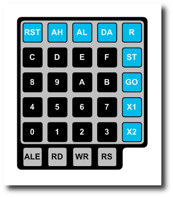 モニタープログラムは,表1に示すパラメーターで制御可能です.その実行には,「Data(DA)」と「Address Low(AL)」,「Address High(AH)」という3つのモードがあります.モニタープログラム実行中に,MM-8000のキーボード(右図)でDAを押すと,80FA番地の値がFCに,80FB番地の値が80になります.その後,キーボードで16進数の二桁の値(1バイト)を入力すると,Display Data(DDA)である80FC番地にその二桁の16進数の値が格納されます.同じように,キーボードのALを押すと,80FA番地と80FB番地,80FD番地の値を書き換えることができます.AHボタンでも同じようなことができます.したがって,モニタープログラムの実行モードはMode Lのバイトを見ることで分かります.それが,FCならばDDA,FDならばDAL,FEならばDAHとなります.Mode Hのバイトは常に80です.Mode LとMode Hの二つのバイトで,DDAとDAL,DAHのアドレスを示します.おのおののモードの動作は,以下の通りです. [注意] 直訳するとこのようになりますが,やっていることは単純です.MM-8000のキーボードのボタン[DA]を押すと Mode L(80FAH番地)が 80Hに, Mode H(80FBH番地)が FCHにになります.Mode L と Mode H に格納されている番地がデータの操作対象の RAM の番地です.次にキーボードから16進数を入力すると,この 80FCH 番地にデータが格納されます.ボタン[AL]と[AH]も同じように,動作します.