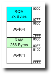 キーボードのストアボタン(ST)を押すと,DAHとDALで指し示すアドレスに,DDA(80FC番地)のデータをコピーできます.そして,このアドレスは+1加算され,モニターはDAモードになり,格納されたデーがディスプレイに表示されます.アドレスが自動的に+1加算されることにより,引き続いたアドレスにつぎつぎとデータを入力することができます. キーボードのリードボタン(R)を押すと,DAHとDALで指し示すアドレスのデータを読み込み,DDA(80FC番地)にコピーすることができます.そしてアドレスは自動的に+1加算されます.モニターは,DAモードになり読み込んだデータが表示されます. キーボードのGOボタンを押すと,DAHとDALで指し示すアドレスに実行が移ります.DAHとDALがプログラムカウンター(PC)の値になります. キーボードのX1とX2ボタンは,将来の拡張用です.現状は,これらのボタンを押すと,モニタープログラムが再起動します. メモリー配置