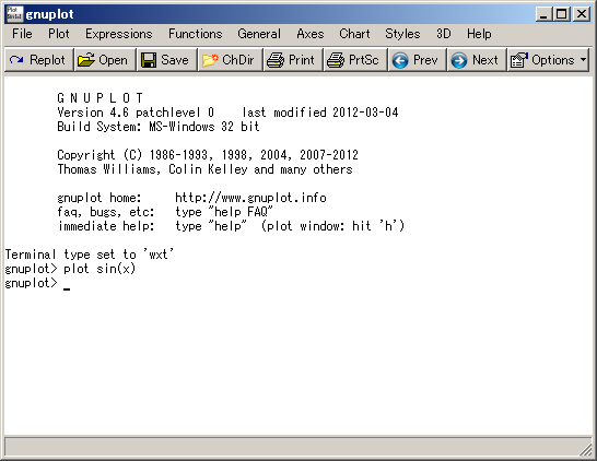 gnuplotターミナルコマンドプロンプトでコマンド「wgnuplot」をタイプする,あるいは windows の > > を選択します.すると,gnuplot のターミナルが起動します.そして,コマンド「plot sin(x)」をタイプします(図12).すると図13のようなプロットが現れます.このプロットは,コマンドプロンプトから作成した図11と全く同一です. バージョン 4.6 のインストールgnuplot 4.6 のインストールを方法を示します. インストール手順以下,Windows版の gnuplot 4.6 のインストール方法を示します.