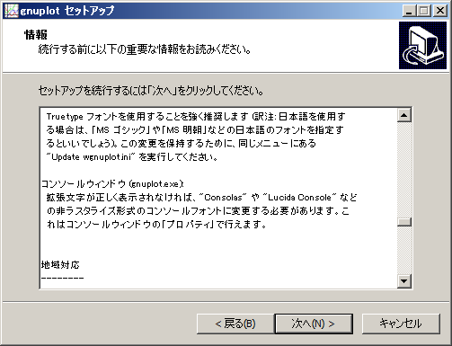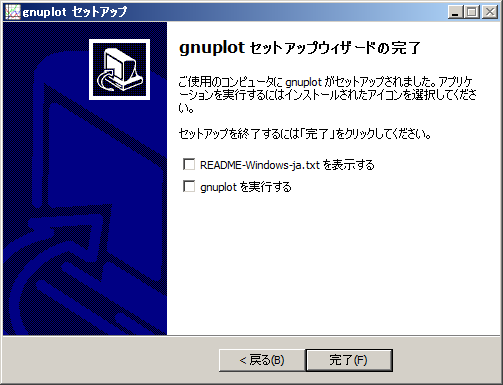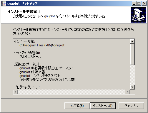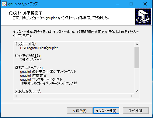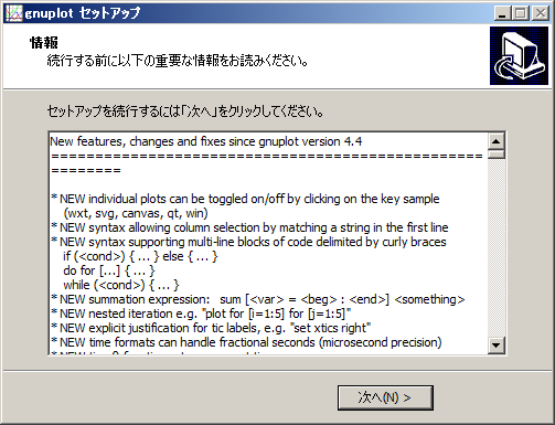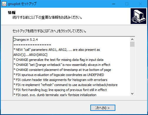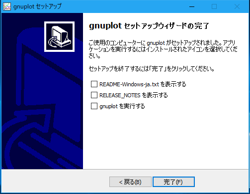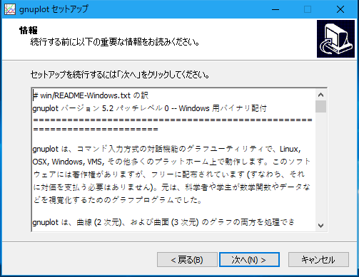 gnuplotインストール (Windows)Windows および Linux への gnuplot のインストール方法を示します. 目次バージョン 5.2 のインストールgnuplot 5.2 のインストールを方法を示します. インストール手順Windwos 版の gnuplot 5.2 のインストール手順を示します.