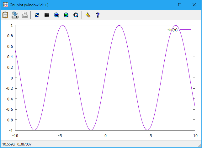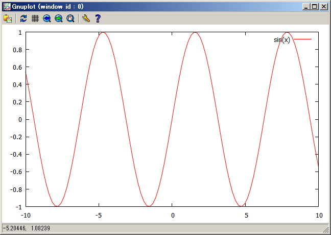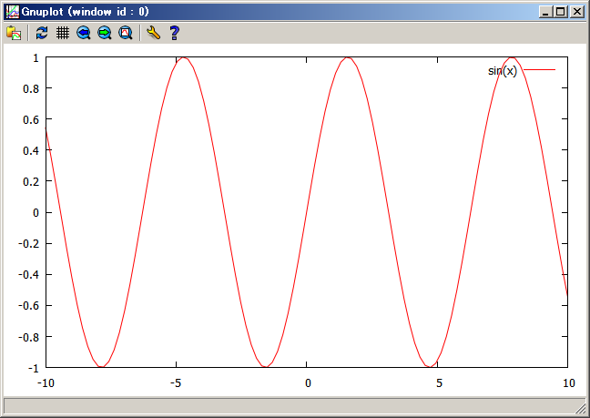 以上で,gnuplot 5.2 のインストールは完了です. 設定先に示したインストールの8番目の「実行ファイルのディレクトリをPATH環境変数に追加する」をチェックしてインストールできていれば,特に設定すべきものはありません.環境変数PATHは,コマンドプロンプトでコマンド「path」を実行させると確認できます.「C:\Program Files\gnuplot\bin」あるいは「C:Program Files(x86)\gnuplot\bin」が表示されれば,OKです.もし,PATHに含まれていない場合は,追加してください. 確認確認は,二つの方法で行います.コマンドプロンプトを使う方法と gnuplot のターミナルからを使う方法です. コマンドプロンプトコマンドプロンプトを起動します.そして,コマンド「gnuplot」をタイプして,対話モードに入ります.コマンド「plot sin(x)」をタイプすれば,図11の様なグラフが表示されます.このグラフが表示されれば,インストールには問題がありません.