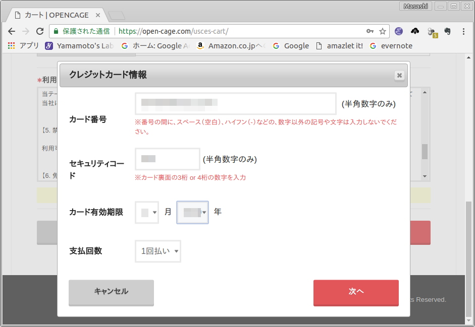 - クレジットカード情報のページが現れます.必要項目を記入し,次へ をクリックします(図6).